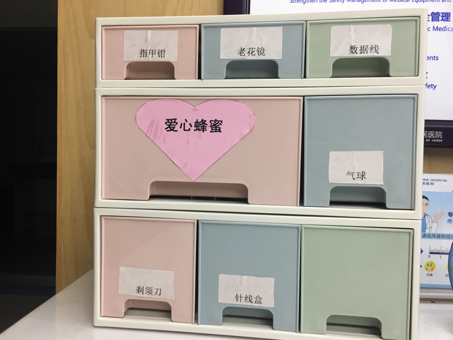 患者住院期間往往會因為匆忙入院或是考慮不周物品準(zhǔn)備的不齊全。比如,老年患者忘了戴花鏡,拿著各種報告單卻看不清,給住院生活帶來了不便;需要記錄電話號卻沒有紙和筆……這些住院患者日常生活中的不便之處,醫(yī)護(hù)人員都看在眼里,記在心上。原有的便民箱物品不能滿足患者需求,護(hù)士長組織對全科護(hù)士、醫(yī)生、患者及家屬進(jìn)行調(diào)研,大家集思廣益,收集并整理了患者使用頻率高的物品,專門購置了格子組合式的儲物箱來收納,患者可以根據(jù)自己的需求借用,解決患者和家屬的燃眉之急,為患者提供更加溫馨、舒適的住院環(huán)境,讓他們在五官科病區(qū)感受到家的溫暖。