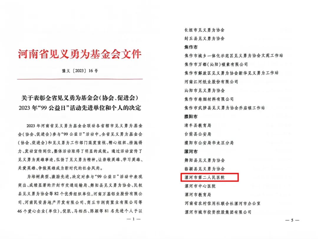近日,市二院被河南省見義勇為基金會(huì)授予全省2023年“99公益日”活動(dòng)先進(jìn)單位榮譽(yù)稱號(hào)。
