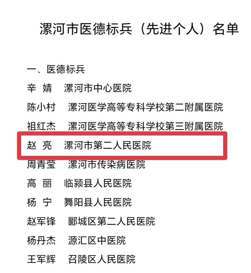 近年來,趙亮先后榮獲“漯河市五一勞動獎?wù)?rdquo;“漯河市職工職業(yè)道德建設(shè)十佳職工”“漯河市青年崗位能手”“漯河市優(yōu)秀醫(yī)師”等榮譽(yù)。一直以來他以白求恩、林巧稚為榜樣,恪守職業(yè)道德,廉潔自律,文明行醫(yī),全心全意為患者提供優(yōu)質(zhì)服務(wù),深受廣大患者尊敬和好評。