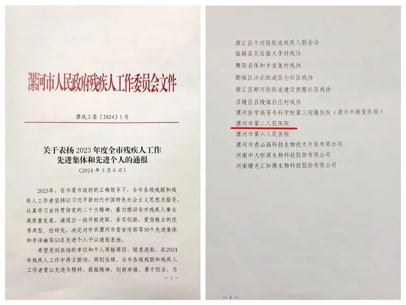 3月6日,漯河市人民政府殘疾人工作委員會(huì)發(fā)布《關(guān)于表?yè)P(yáng)2023年度全市殘疾人工作先進(jìn)集體和先進(jìn)個(gè)人的通報(bào)》,市二院榮獲“2023年度全市殘疾人工作先進(jìn)集體”榮譽(yù)稱號(hào)。