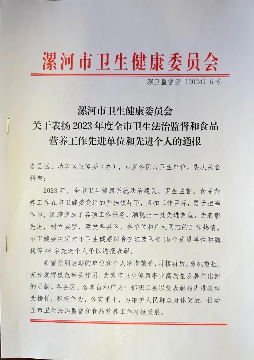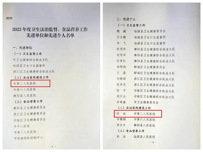 在3月20日召開(kāi)的2024年度全市疾病預(yù)防控制、衛(wèi)生法治監(jiān)督暨食品營(yíng)養(yǎng)工作會(huì)議上,市二院榮獲2023年度全市法治醫(yī)院建設(shè)工作先進(jìn)單位,陳誠(chéng)榮獲全市法治醫(yī)院建設(shè)工作先進(jìn)個(gè)人。