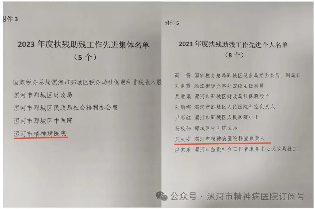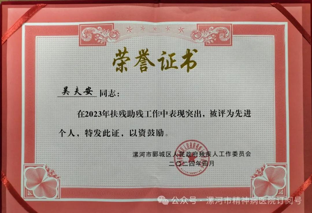 2024年4月24日上午,在漯河市郾城區(qū)殘聯(lián)“關(guān)于表彰2023年度全區(qū)殘疾人工作先進集體和先進個人”表彰會議中,漯河市精神病醫(yī)院獲得“2023年度扶殘助殘工作先進集體”,吳夫安同志在2023年度扶殘助殘工作中表現(xiàn)突出被評為“先進個人”榮譽稱號。