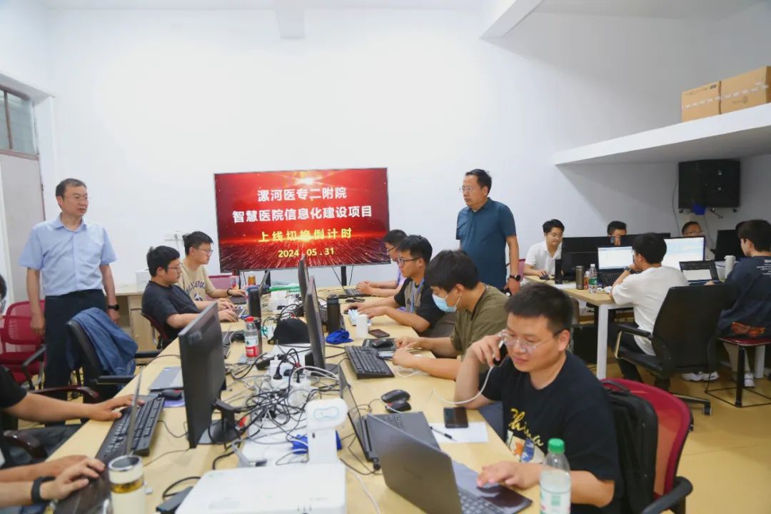 5月31日晚,院長李奎、副院長曹鵬克一行深入信息科、藥房、各臨床科室和醫(yī)技科室檢查新系統(tǒng)切換前的各項工作,一切準備就緒。6月1日零點,新系統(tǒng)正式切換上線。按照預定安排,軟件工程師們和信息科工作人員全部下沉到各科室工作一線,及時解決系統(tǒng)運行中出現(xiàn)的問題,有序地對全業(yè)務流程進行保障。6月1日早8點,新系統(tǒng)第一張電子入院證辦理成功!患者在病區(qū)順利辦理入住。隨后,來自新系統(tǒng)的第一張掛號單、第一張檢查、檢驗申請單、第一張?zhí)幏絾我蚕嗬^開出。患者也順利完成掛號、檢查、取藥等就醫(yī)流程。在系統(tǒng)工程師的辛勤工作和各科室工作人員的相互配合下,新系統(tǒng)運行平穩(wěn),各科室醫(yī)療業(yè)務工作開展順利,新信息系統(tǒng)切換工作取得圓滿成功。