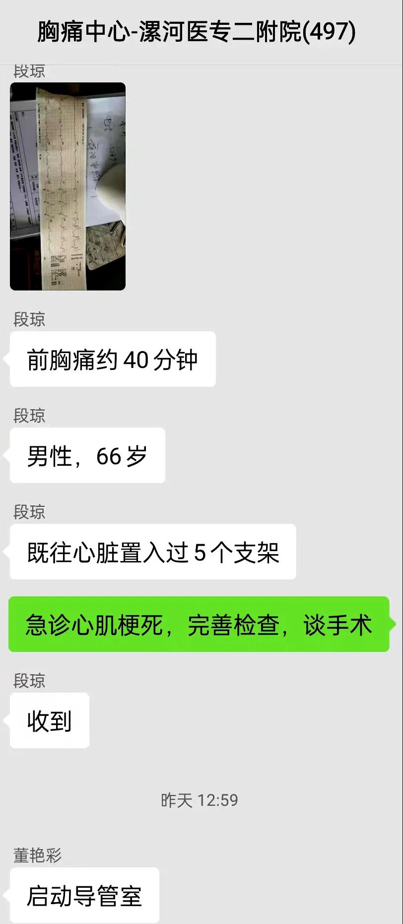 7月4日中午,漯河市骨科醫(yī)院(漯河醫(yī)專二附院、漯河市立醫(yī)院)胸痛中心工作群內(nèi),一連串工作指令相繼發(fā)出。