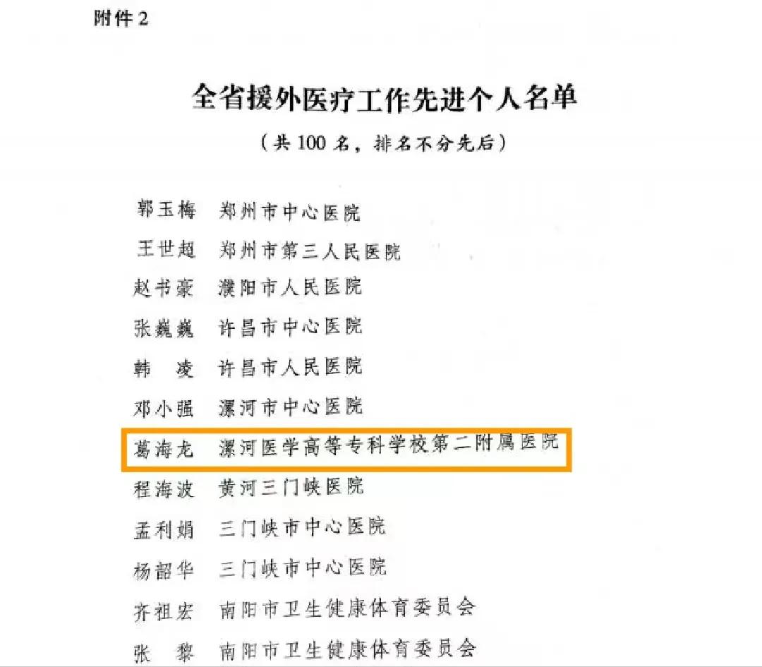在紀(jì)念河南省承派援外醫(yī)療隊(duì)50周年的重要時(shí)刻,為表揚(yáng)先進(jìn)、樹立楷模,省衛(wèi)生健康委隆重舉行紀(jì)念大會(huì),對包括援埃塞俄比亞中國醫(yī)療隊(duì)群體在內(nèi)的47個(gè)優(yōu)秀集體以及100名杰出個(gè)人進(jìn)行了通報(bào)表揚(yáng)。其中,漯河市骨科醫(yī)院(漯河醫(yī)專二附院、漯河市立醫(yī)院)葛海龍榮獲全省援外醫(yī)療工作先進(jìn)個(gè)人!