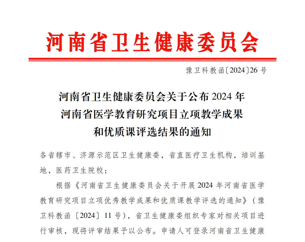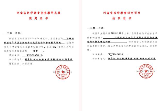 近日,河南省衛(wèi)生健康委員會下發(fā)了《關于公布2024年河南省醫(yī)學教育研究項目立項教學成果和優(yōu)質(zhì)課評選結(jié)果的通知》,由漯河市骨科醫(yī)院(漯河醫(yī)專二附院、漯河市立醫(yī)院)王瓊、趙春紅、楊冬松、曹慧芳、陳敏、韓書環(huán)、柴翠萍團隊完成的《區(qū)域醫(yī)療聯(lián)合體內(nèi)基層醫(yī)院護士規(guī)范化培訓管理模式構(gòu)建》項目完成結(jié)項,被授予2024年河南省醫(yī)學教育優(yōu)秀教學成果一等獎。