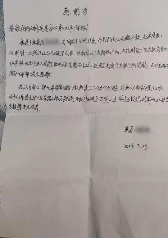 病情穩(wěn)定后,患者及家屬特意送來感謝信,向心內(nèi)一科的全體醫(yī)務(wù)人員表達(dá)感謝。漯河市骨科醫(yī)院(漯河醫(yī)專二附院、漯河市立醫(yī)院)心血管內(nèi)科一病區(qū)(內(nèi)三科)始終以病人為中心,以專業(yè)的技術(shù)和細(xì)致入微的關(guān)懷提供優(yōu)質(zhì)醫(yī)療服務(wù),全力以赴為病人的健康保駕護(hù)航!(盧 闖 劉 旭 袁錦鈺)