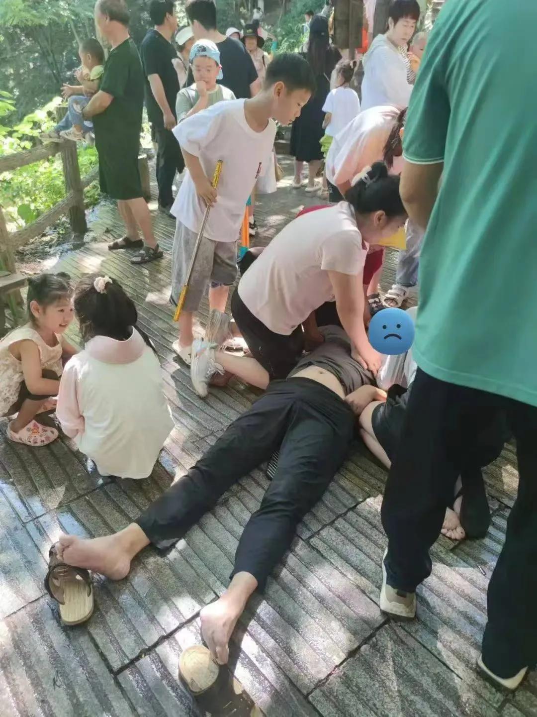 8月13日,王美娜和家人到洛陽重渡溝游玩。因為重癥醫(yī)學科工作的特殊性,王美娜很少和家人外出,孩子們都很開心。上午11時左右,在水簾仙宮瀑布旁,王美娜突然看到不遠處亂作一團:有游客突然倒地,家人慌了神,其他游客也不知道如何處理,有幾個游客大聲疾呼。王美娜在重癥醫(yī)學科工作多年,各種突發(fā)情況都經常遇見,但是在院外還是第一次遇到,完全是職業(yè)本能促使她下意識作出反應,立刻奔過去,并亮明身份:我是急救護士。大家立刻有了主心骨,人群安靜下來。