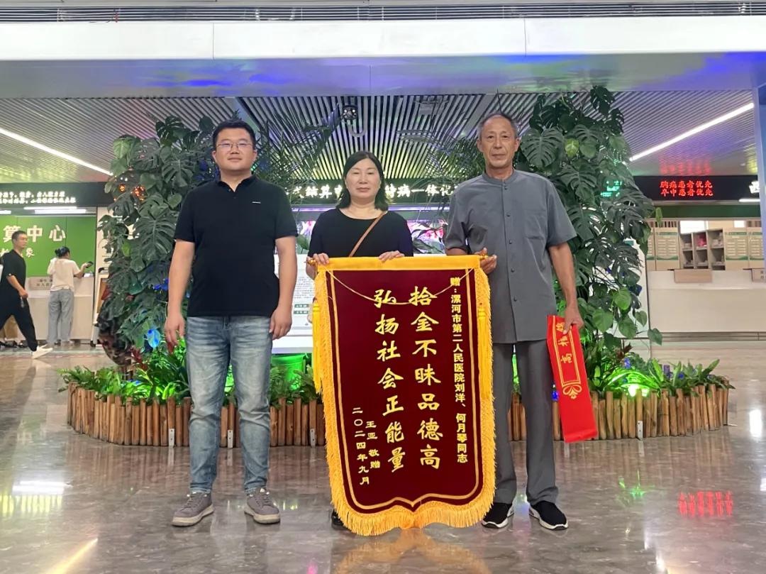 后來,經(jīng)醫(yī)院相關(guān)工作人員,根據(jù)錢包里面的信息,多方渠道尋找,最終與失主王先生取得了聯(lián)系,核對確認身份后,將錢包物歸原主。失主連聲感謝,對醫(yī)務(wù)人員拾金不昧的精神連連點贊,并特意送來寫有拾金不昧品德高,弘揚社會正能量的錦旗一面。
