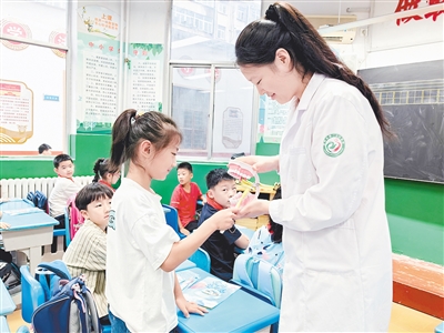 課間,口腔健康科普教育展板吸引學生們的目光??谇会t(yī)師認真向學生們講解了口腔健康的重要性,教育他們從小養(yǎng)成保護牙齒的好習慣。