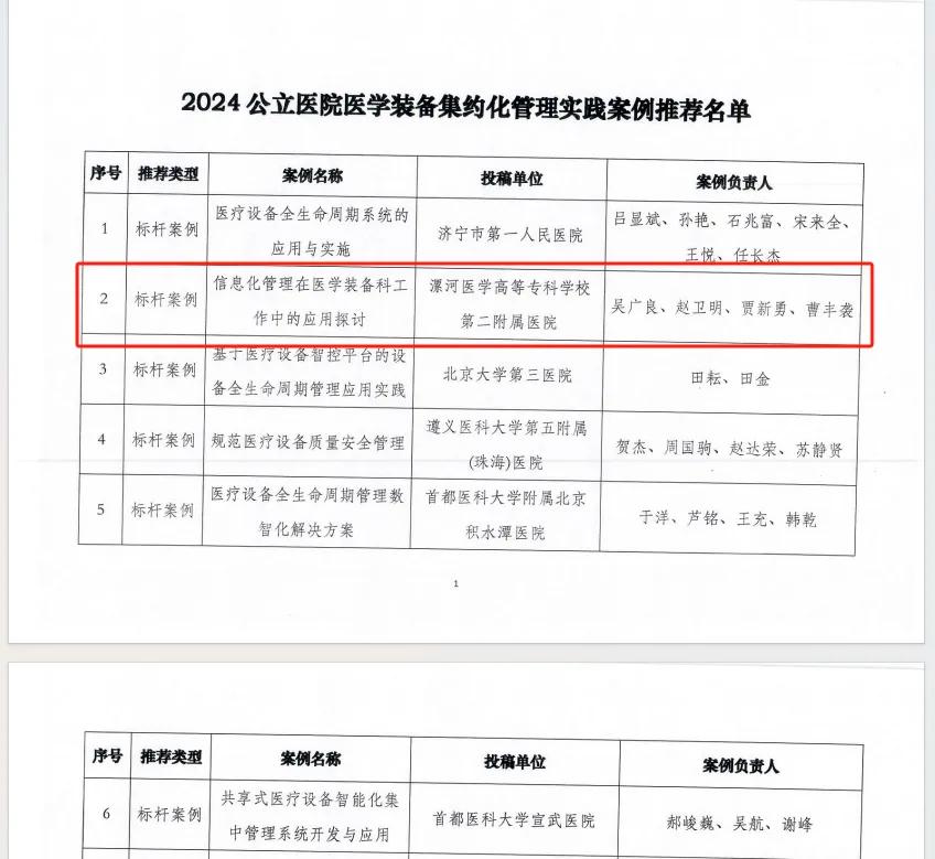 其中我院醫(yī)學(xué)裝備集約化管理案例《信息化管理在醫(yī)學(xué)裝備科工作中的應(yīng)用探討》經(jīng)過激烈角逐,最終與首都醫(yī)科大學(xué)附屬北京積水潭醫(yī)院、北京大學(xué)第三醫(yī)院、首都醫(yī)科大學(xué)宣武醫(yī)院、濟寧市第一人民醫(yī)院、遵義醫(yī)科大學(xué)第五附屬醫(yī)院在“標桿案例”板塊中脫穎而出,成功入選全國公立醫(yī)院醫(yī)學(xué)裝備集約化管理實踐案例“標桿案例”推薦。是全省唯一入選的標桿案例,也是我院醫(yī)學(xué)裝備管理工作首次榮獲國家級殊榮!
