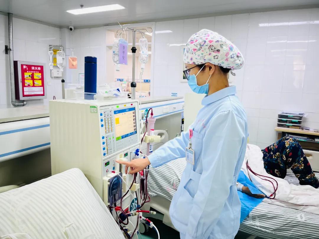 血液凈化室是一個(gè)安靜的地方。透析機(jī)發(fā)出的“嘀嗒”聲和患者的呼吸聲成為這里獨(dú)特的旋律。每天早上7點(diǎn),我會(huì)準(zhǔn)時(shí)到崗,檢查機(jī)器、配制抗凝劑等,做好患者上機(jī)前的準(zhǔn)備工作;透析過程中,認(rèn)真監(jiān)測(cè)患者生命體征……對(duì)每一個(gè)步驟都嚴(yán)謹(jǐn)細(xì)致。在這個(gè)沒有硝煙的戰(zhàn)場(chǎng)上,我時(shí)刻保持警惕,為患者健康盡心盡力。