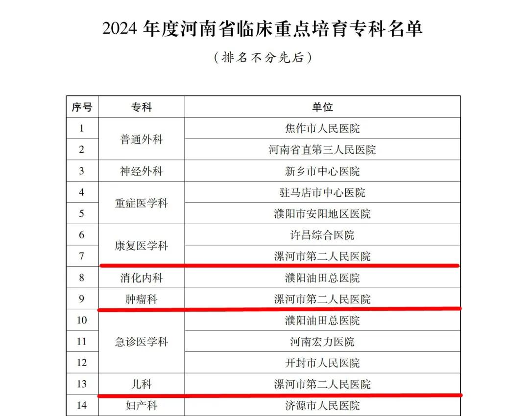 12月24日,河南省衛(wèi)生健康委下發(fā)了《關(guān)于公布2024年度河南省臨床重點專科及特色??泼麊蔚耐ㄖ罚ㄔバl(wèi)醫(yī)〔2024〕45號)。市二院兒科、腫瘤科(腫瘤放療科、腫瘤內(nèi)科)、康復(fù)醫(yī)學(xué)科成功通過評審,被確定為河南省臨床重點培育??啤?/div>