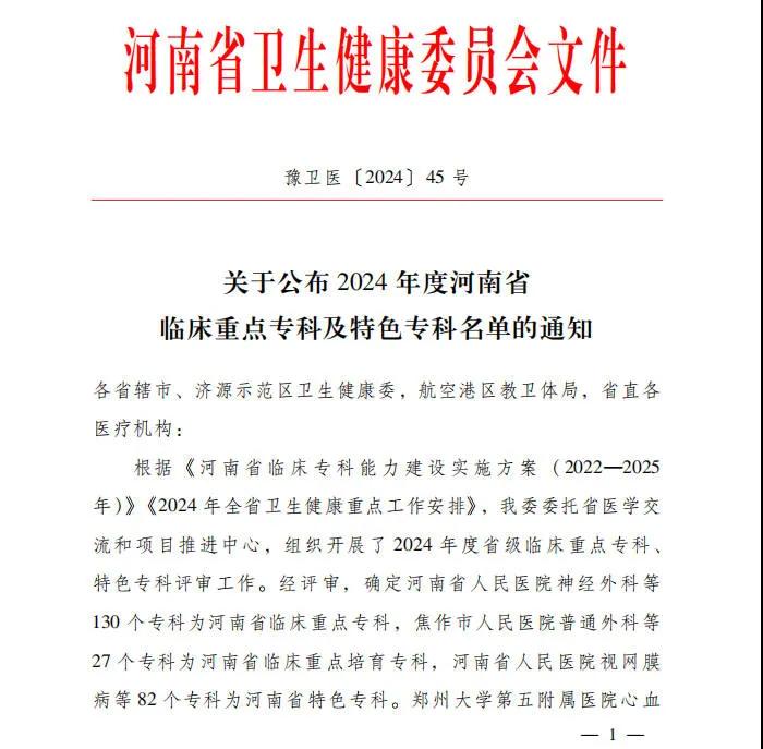 12月24日,河南省衛(wèi)生健康委下發(fā)《關(guān)于公布2024年度河南省臨床重點(diǎn)??萍疤厣珜?泼麊蔚耐ㄖ罚ㄔバl(wèi)醫(yī)〔2024〕45號(hào))。漯河醫(yī)專高等專科學(xué)校第二附屬醫(yī)院運(yùn)動(dòng)醫(yī)學(xué)科、護(hù)理專科成功通過評(píng)審,被確定為河南省臨床重點(diǎn)培育???。