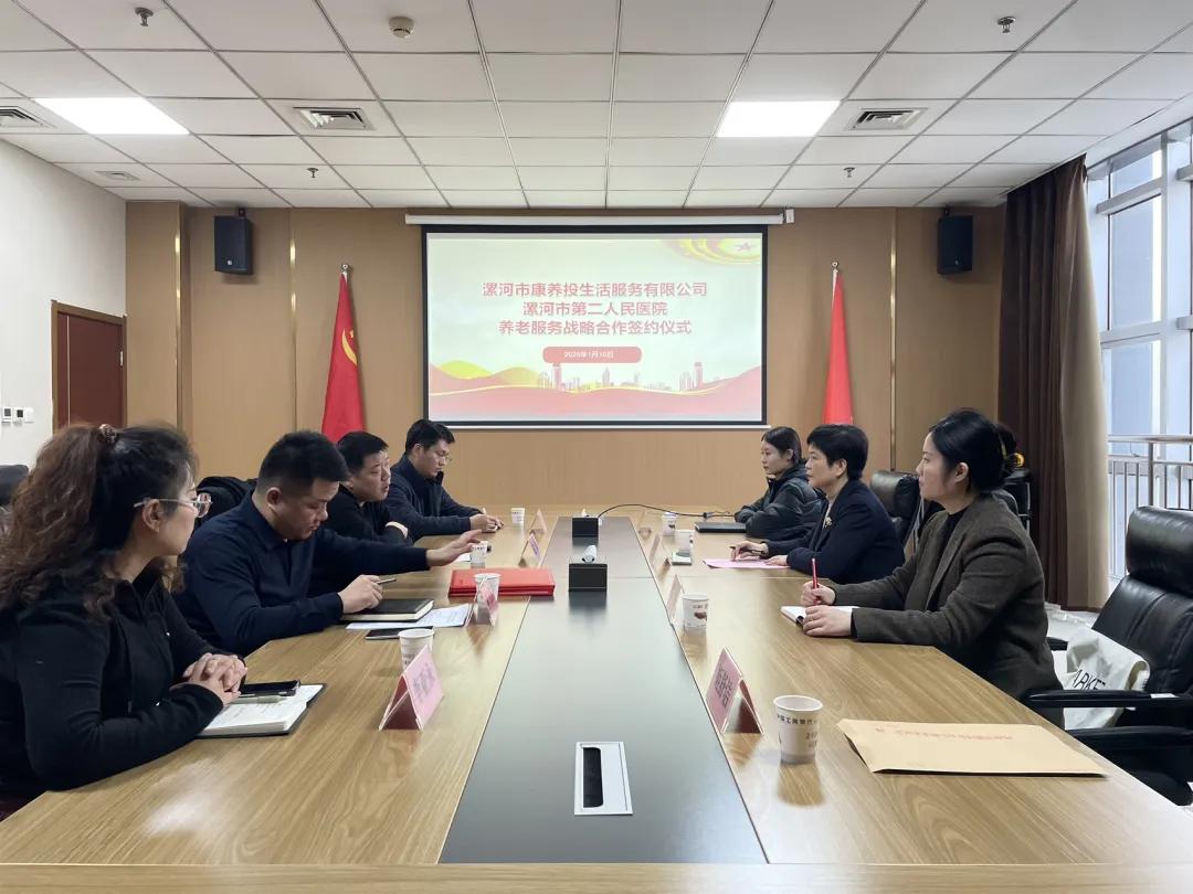 為探索醫(yī)養(yǎng)結(jié)合工作新模式,助力我市構(gòu)建醫(yī)養(yǎng)結(jié)合的養(yǎng)老服務(wù)體系新路徑,1月10日下午,市二院作為全市首家簽約單位與漯河市康養(yǎng)投公司簽訂醫(yī)養(yǎng)戰(zhàn)略合作協(xié)議,為漯河地區(qū)智慧養(yǎng)老的發(fā)展注入了新活力。市民政局養(yǎng)老科科長趙煒,市康養(yǎng)投生活公司董事長靳元浩,市二院副院長劉橋、醫(yī)聯(lián)體辦公室副主任張靜出席簽約儀式。