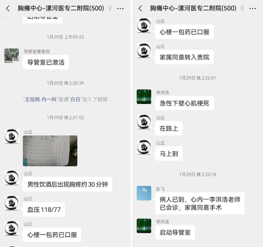 1月29日,正值大年初一,當(dāng)晚9點(diǎn)52分,漯河醫(yī)專二附院胸痛中心工作群內(nèi)接到信息,“一位男性患者飲酒后出現(xiàn)胸疼約30分鐘”。