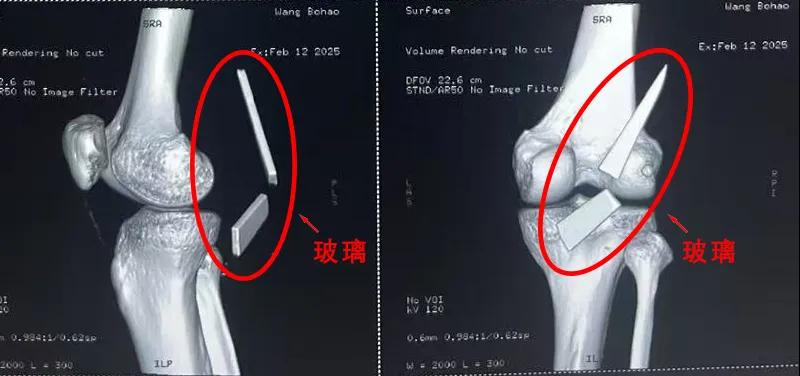 患者家屬這才開始意識到問題的嚴重性,便帶著孩子到鄉(xiāng)鎮(zhèn)衛(wèi)生院檢查——結(jié)果顯示右膝關(guān)節(jié)后方竟然殘留著兩塊兒鋒利的碎玻璃,測量后預估玻璃總長將近13厘米!