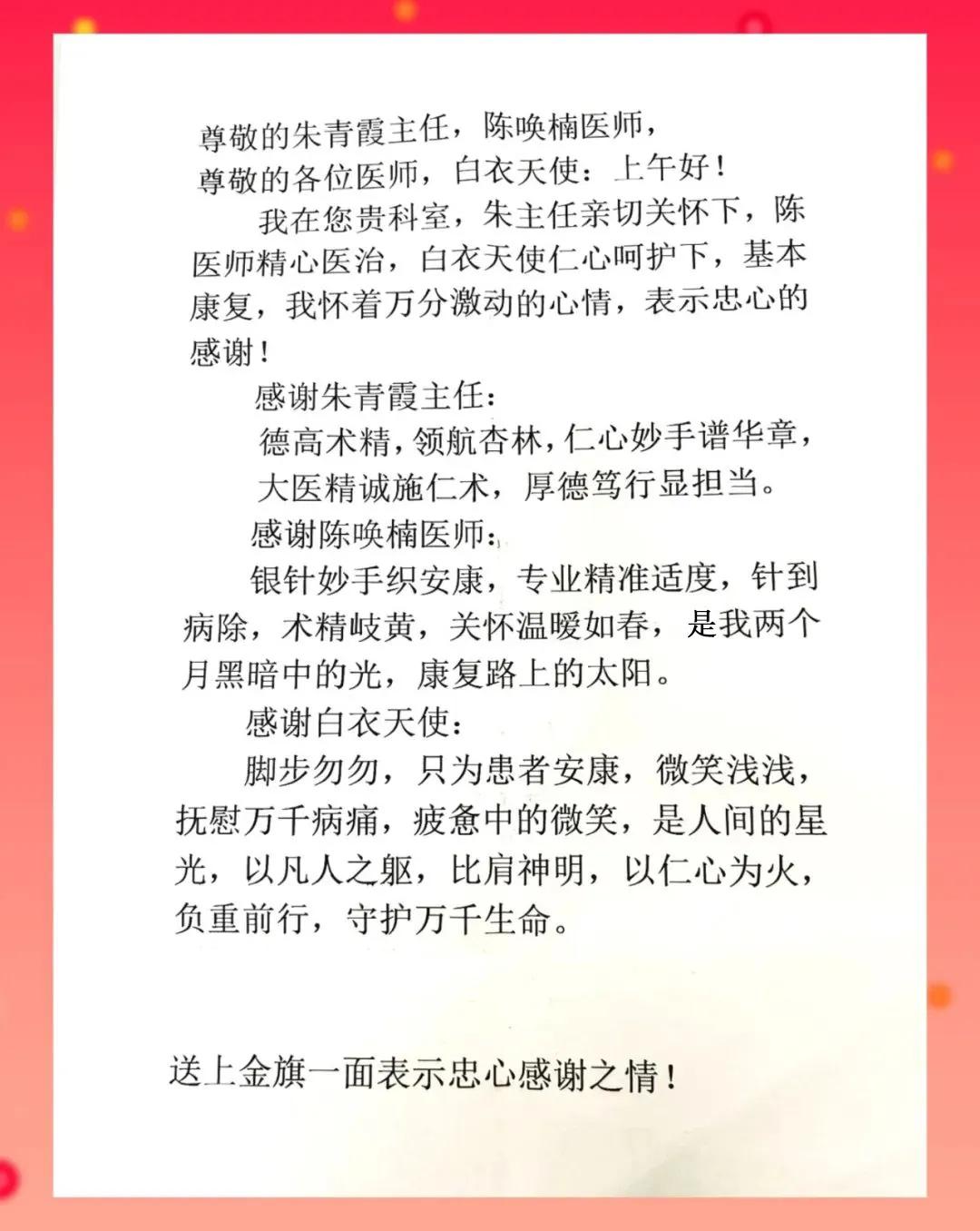 近日,市二院中醫(yī)針灸科門診醫(yī)護人員一如既往地忙碌著。突然,走廊里傳來一陣熱烈的掌聲,原來,74歲的田大叔在家人陪伴下,手捧錦旗和感謝信來到醫(yī)院。田大叔激動地展開感謝信,聲情并茂地朗讀起來,說到動情處更是眼含熱淚,字里行間飽含著對中醫(yī)針灸科主任朱青霞的誠摯謝意和對整個醫(yī)護團隊精湛醫(yī)術(shù)與暖心服務(wù)的認(rèn)可與贊美。讀完,田大叔深深地鞠躬致謝,這一躬身,更是見證中醫(yī)針灸科‘破冰’三十年病痛,醫(yī)患同心最好的詮釋。