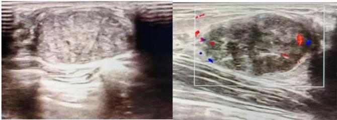 橢圓形低回聲團(tuán)塊,包膜完整,內(nèi)部回聲均勻,后方回聲增強(qiáng),周邊無“蟹足樣”浸潤。