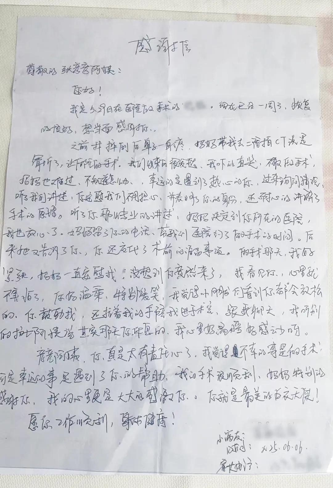 看似一個(gè)很平常的舉動(dòng),當(dāng)孩子?jì)寢尭嬷⒆右院螅∨笥言谛牡追N下了感恩的種子,出院以后專(zhuān)程來(lái)醫(yī)院送來(lái)了這封感謝信......
