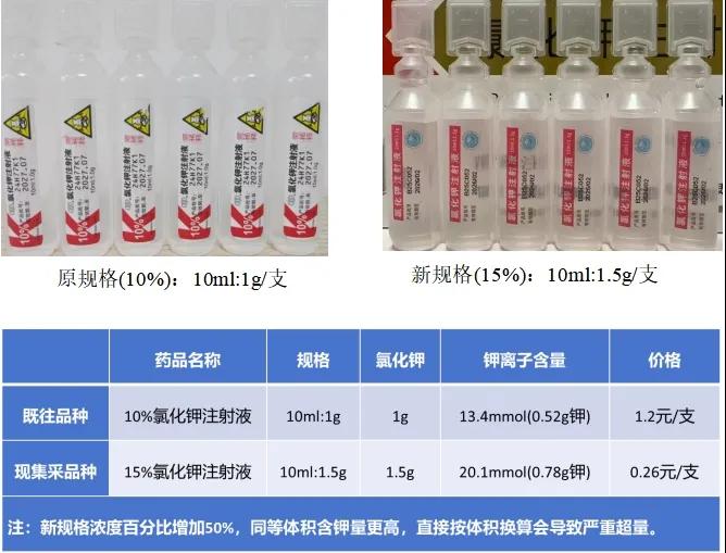氯化鉀注射液是臨床常用的電解質補充劑,廣泛用于治療和預防低鉀血癥,以及洋地黃類藥物中毒引起的頻發(fā)性、多源性早搏或快速心律失常、低鉀性肌無力等。隨著第十批國家藥品集中采購品種的落地實施,氯化鉀注射液規(guī)格由以往長期使用的10ml:1.0g/支,濃度10%調整為10ml:1.5g/支,濃度15%,作為A類高警示藥品,其規(guī)格、濃度的變化直接關系到臨床用藥安全,若操作不當可能引起嚴重用藥錯誤。本文系統(tǒng)梳理臨床配制關鍵風險點,幫助醫(yī)務人員合理應用集采氯化鉀注射液,避免因劑量變化導致用藥風險。