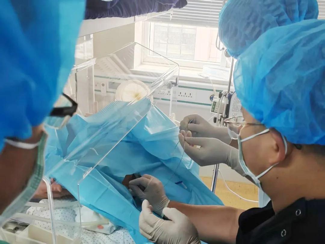 新生兒團隊立即更換無創(chuàng)呼吸機為“有創(chuàng)呼吸機”高頻震蕩通氣(減少肺損傷),呼吸困難仍未緩解,血氧飽和度維持在85%左右,立即聯(lián)系胸外科劉鵬濤主任緊急會診。在仔細查看患兒情況后,劉鵬濤診斷患兒為氣胸,需行胸腔穿刺閉式引流術,排氣緩解呼吸困難,立即準備進行麻醉、行右側胸腔穿刺置管,負壓引流排氣。穿刺成功瞬間,水封瓶內氣體“嘶嘶”排出,壓縮的肺重新張開,約5分鐘后患兒呼吸困難明顯緩解,膚色轉紅潤,血氧飽和度上升至95%左右,一根細細的引流管緩解了危機,大家心里終于松了一口氣。