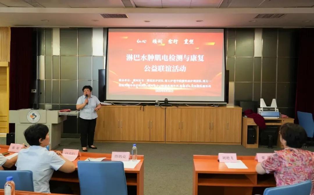 為了幫助乳腺疾病術(shù)后及術(shù)后出現(xiàn)淋巴水腫患者提高防治意識,漯河醫(yī)專二附院淋巴水腫MDT團隊,由護理部趙春紅主任倡導(dǎo),傷口造口治療室負責(zé)人成瀚牽頭,康復(fù)科負責(zé)人張靜及護士長田智慧,康復(fù)科肌電圖室張朝紅主任團隊,急診外科張曉光主任淋巴水腫手術(shù)團隊,外一科陳原主任及外三科護士長丁亞楠團隊,漯河醫(yī)專二附院取得國家級證書的所有人員共同參與本次活動。