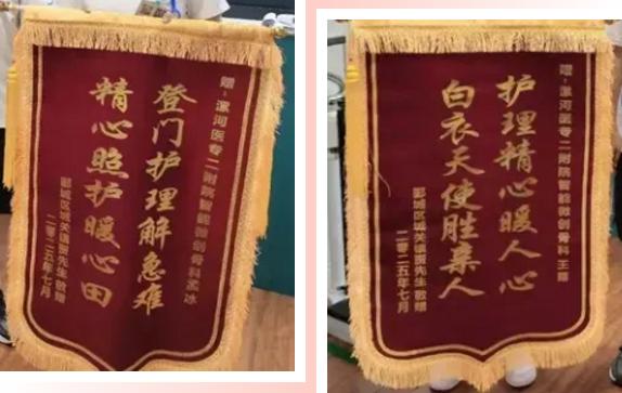 “真是太感謝孟冰和王露護(hù)士了,這兩面錦旗你們一定要收下!”7月16日,一名老年患者家屬將兩面錦旗送到了漯河醫(yī)專二附院(漯河市骨科醫(yī)院、漯河市立醫(yī)院)智能微創(chuàng)骨科護(hù)士站,再三感謝兩位護(hù)士上門(mén)為老人維護(hù)、更換導(dǎo)尿管。