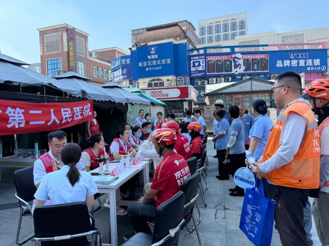 活動現(xiàn)場,來自市二院眼科、骨科、中醫(yī)針灸科、口腔科、老年醫(yī)學(xué)科、耳鼻喉科等科室的專家志愿者們,一對一地為美團、京東、UU跑腿的騎手們以及美盛物業(yè)、丹尼斯百貨工作人員進行測量血壓、AI診脈、視力檢測、眼底篩查等醫(yī)療服務(wù)。針對夏季高發(fā)的腸胃不適、皮膚曬傷、中暑預(yù)防等職業(yè)相關(guān)健康問題提供個性化診療建議及針對性預(yù)防措施。