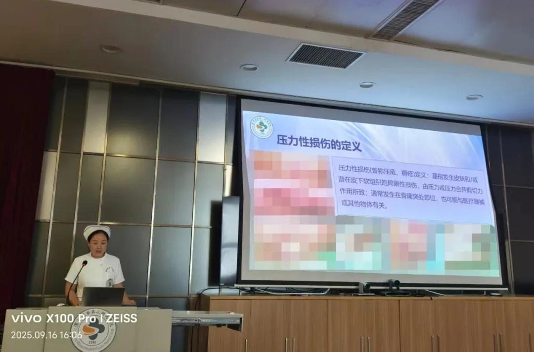 培訓伊始,壓力性損傷/傷口護理學組會診干預組長張燕燕老師帶來關于《新型敷料在壓力性損傷中的應用》的主題分享。她結(jié)合大量臨床案例,細致講解了各類新型敷料的材質(zhì)特性、適用場景,以及壓力性損傷不同分期對應的敷料選擇策略、操作規(guī)范和效果評估方法。從水膠體敷料到泡沫敷料,從藻酸鹽敷料到銀離子敷料,張老師一一剖析,讓參訓人員對新型敷料的臨床應用有了更精準、全面的認識,為科學選擇和使用敷料提供了堅實理論支撐。