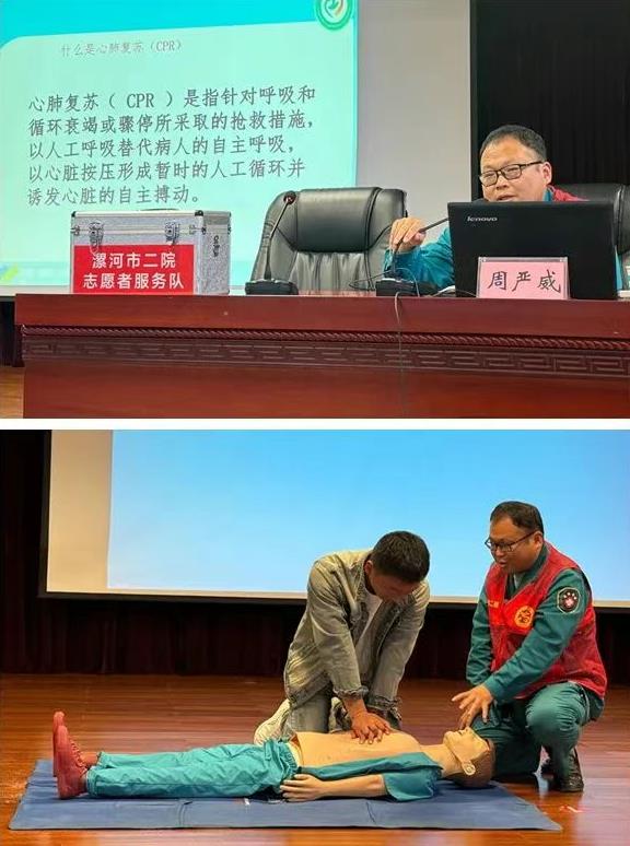 隨后,急診科副主任醫(yī)師周嚴(yán)威圍繞《應(yīng)急急救技能實(shí)操》進(jìn)行專題講解與現(xiàn)場(chǎng)演示,重點(diǎn)聚焦海姆立克急救法與心肺復(fù)蘇術(shù)兩大關(guān)鍵技能。為讓職工更直觀掌握動(dòng)作要領(lǐng),周嚴(yán)威副主任醫(yī)師使用人體模型進(jìn)行多輪演示,同時(shí)邀請(qǐng)現(xiàn)場(chǎng)職工上臺(tái)實(shí)操練習(xí),確保每位參與實(shí)操的職工都能規(guī)范掌握核心步驟。