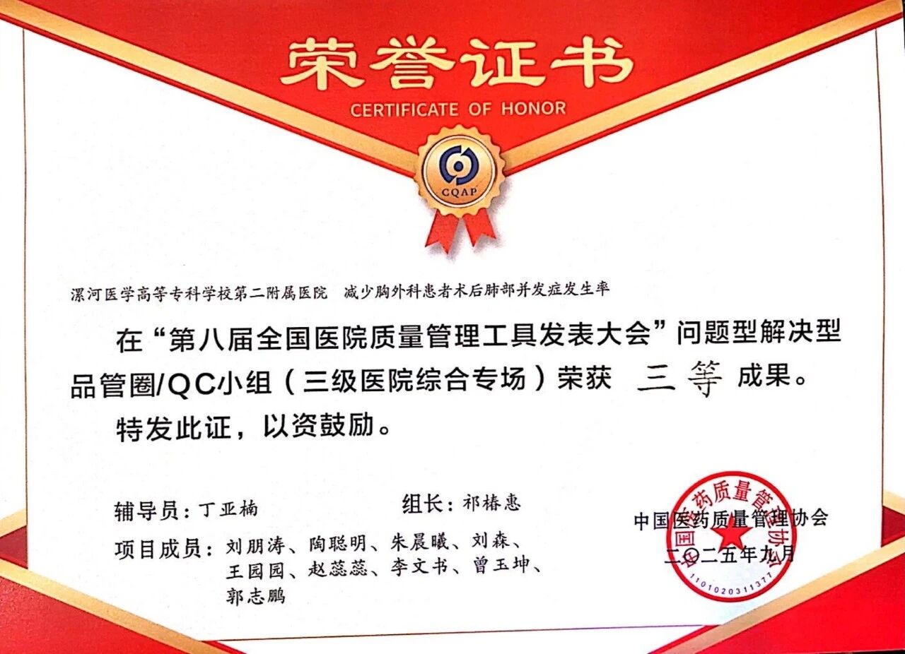 近日,第八屆醫(yī)院質(zhì)量管理工具應(yīng)用成果發(fā)表大會(huì)在重慶落幕。此次大賽共有來(lái)自全國(guó)的600多項(xiàng)課題參賽,其中413個(gè)項(xiàng)目入圍決賽,競(jìng)爭(zhēng)激烈。 漯河醫(yī)專(zhuān)二附院(漯河市骨科醫(yī)院、漯河市立醫(yī)院)關(guān)節(jié)外科選送的RCA項(xiàng)目與胸外科選送的"非常好圈"品管圈項(xiàng)目,在各自專(zhuān)場(chǎng)中展現(xiàn)了扎實(shí)的專(zhuān)業(yè)素養(yǎng),最終在眾多優(yōu)秀團(tuán)隊(duì)中勝出,分別斬獲二等獎(jiǎng)和三等獎(jiǎng)。