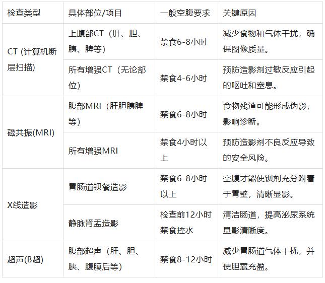 為了方便您快速查閱,以下表格總結(jié)了常見需要空腹的影像檢查類別。