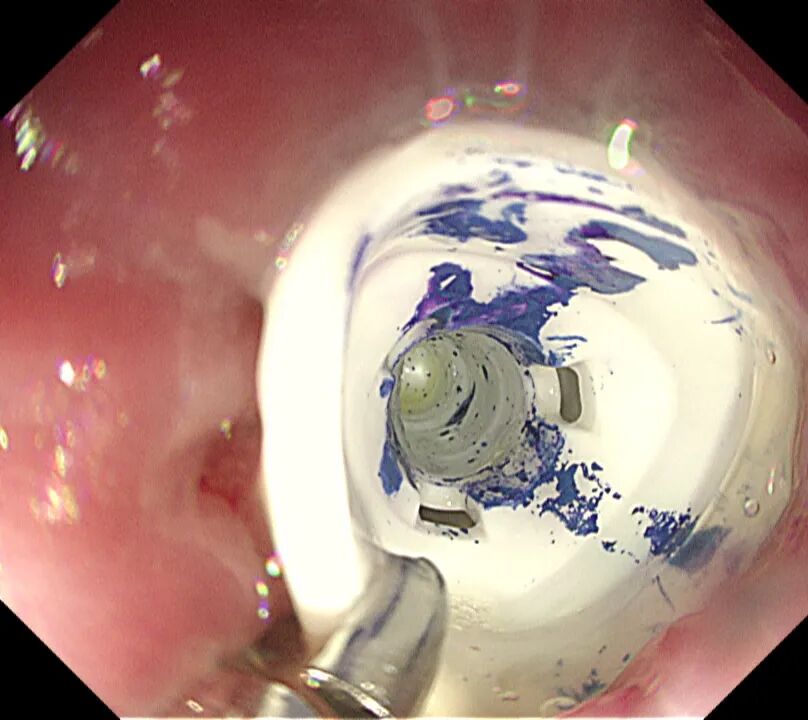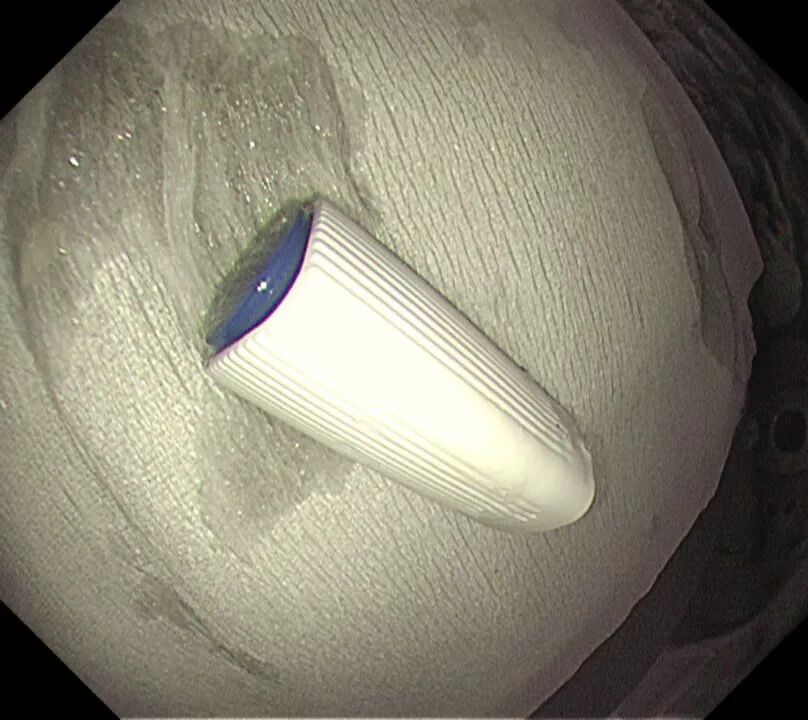 時間不等人,雖已臨近晚7點,市二院第一時間啟動應(yīng)急響應(yīng)機制,內(nèi)鏡室、麻醉科醫(yī)護技立即返崗就位,并經(jīng)院辦等職能部門積極協(xié)調(diào),盡可能縮短術(shù)前準(zhǔn)備時間,迅速制定了取出異物的方案。隨后,在全身麻醉下,朗朗安然入睡,醫(yī)生通過纖細(xì)的胃鏡,精準(zhǔn)地找到了那個“惹事”的筆帽位于十二指腸內(nèi),并順利將其取出。整個過程僅用時十幾分鐘,朗朗術(shù)后很快蘇醒,觀察無礙后平安回家。
