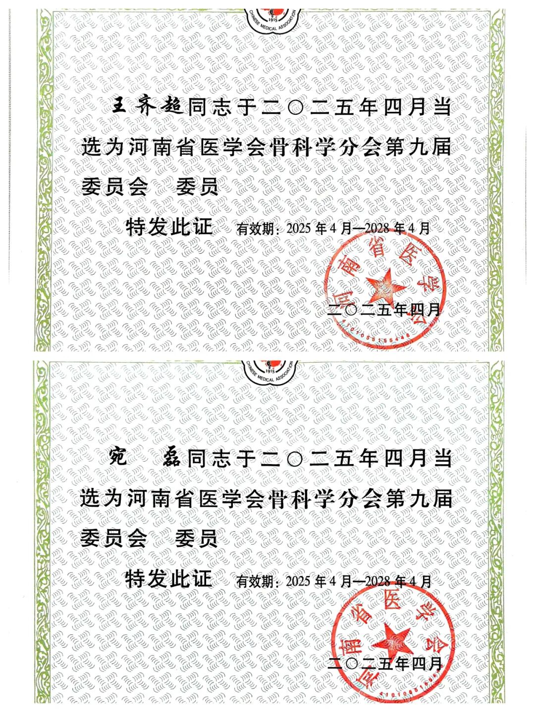 院長王齊超、智能微創(chuàng)骨科主任宛磊分別當(dāng)選為河南省醫(yī)學(xué)會骨科學(xué)分會第九屆委員會委員。