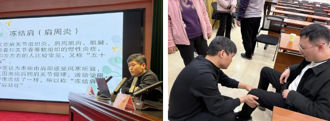 曹愛華主任強(qiáng)調(diào)了卒中防治的重要性,并針對(duì)職場(chǎng)人群常見的健康隱患,詳細(xì)講解了腦卒中的早期識(shí)別方法。同時(shí),分享了高血壓、糖尿病、血脂異常等危險(xiǎn)因素的科學(xué)管控方法,促使大家養(yǎng)成良好的飲食和生活習(xí)慣。宋松根副主任結(jié)合職工工作特點(diǎn),重點(diǎn)講解了冠心病的防治、急性心肌梗死的典型癥狀及急救三步法,并分享了“控血壓、調(diào)血脂、控血糖、適度運(yùn)動(dòng)、堅(jiān)持服藥”的ABCDE健康管理法則。金艷南副主任醫(yī)師則講解了肩周炎常見認(rèn)識(shí)誤區(qū)、多種病因、“疼痛期、僵硬期、緩解期”三階段臨床表現(xiàn)和功能鍛煉的階梯方法,并現(xiàn)場(chǎng)示范了鐘擺運(yùn)動(dòng)、爬墻運(yùn)動(dòng)等簡(jiǎn)單易行的預(yù)防鍛煉動(dòng)作,從日常細(xì)節(jié)中守護(hù)關(guān)節(jié)健康。