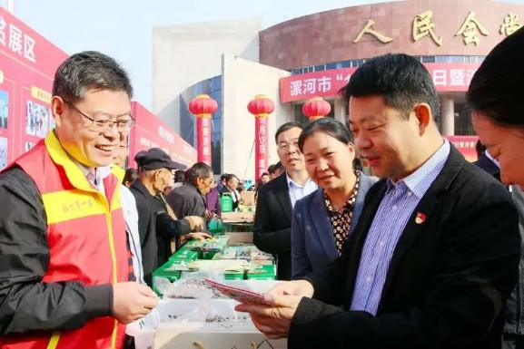郭紅福(左)在漯河市消費扶貧活動啟動儀式上為貧困戶產(chǎn)品代言
