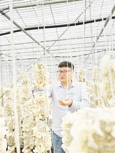 賈云鵬在大棚觀察白玉木耳長勢。