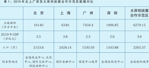 當(dāng)前,深圳建設(shè)社會(huì)主義先行示范區(qū)的全新定位,對(duì)深圳的發(fā)展空間和資源配置提出了新要求。深圳要為社會(huì)主義現(xiàn)代化強(qiáng)國(guó)探索出新路徑,打造出一個(gè)城市范例,成為全球標(biāo)桿城市,深圳向外拓展、加強(qiáng)與周邊城市的合作成為必然選擇。規(guī)劃中的深河(河源市江東新區(qū))合作區(qū)預(yù)計(jì)面積434平方公里,如能再加上惠州惠陽(yáng)區(qū)、東莞市,深圳擴(kuò)權(quán)統(tǒng)籌的總面積將達(dá)到6279平方公里,達(dá)到一個(gè)巨量的增長(zhǎng),對(duì)深圳增強(qiáng)發(fā)展后勁來(lái)說(shuō)是非常重要的支撐。從2019年五地的土地、人口和生產(chǎn)總值來(lái)看,深圳擴(kuò)權(quán)統(tǒng)籌之后在土地面積、人口資源方面在北上廣深中的實(shí)力將進(jìn)一步躍升(見(jiàn)表1),這是深圳未來(lái)作為國(guó)際化創(chuàng)新型城市、全球標(biāo)桿城市的必然物質(zhì)基礎(chǔ)。