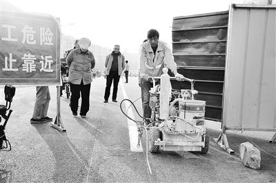 橋面上,有兩位工人正在對橋面進行最后的處理。工作人員也正在忙著施劃行車標線。