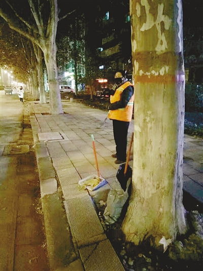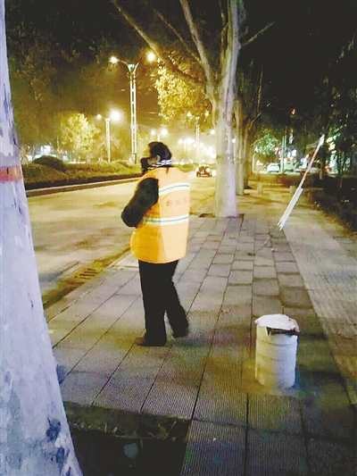 記者通過網(wǎng)友“馮馮馮馮馮好聽啊”聯(lián)系到拍攝這組照片的網(wǎng)友“微微的微笑”。她告訴記者:“11月26日晚上9點(diǎn)左右,我經(jīng)過市區(qū)黃河路與舟山路交叉口附近時,看到這位環(huán)衛(wèi)工人,就拍了幾張照片。”