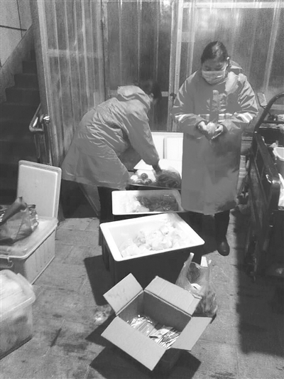 隨后,配送人員將分配好的早餐給環(huán)衛(wèi)工人送下去。