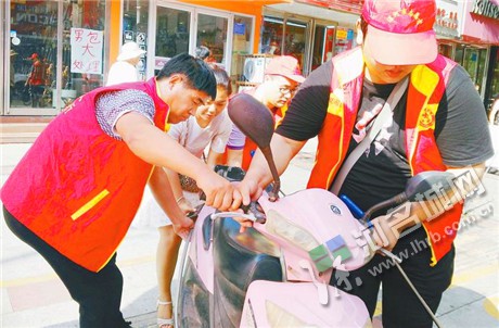 志愿者在馬路街對商戶落實(shí)“門前三包”情況進(jìn)行督導(dǎo),發(fā)現(xiàn)問題現(xiàn)場解決。 漯河日報(bào)全媒體記者 范子恒 攝