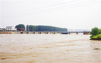 7月23日上午,記者在沙河、澧河交匯處看到,河水流速加快,水位明顯升高,河面顯得寬了不少,渾濁的河水中飄浮著大量水草。沙河節(jié)制閘處閘孔全開,正在全力泄洪,節(jié)制閘兩側(cè)南北河道的水位也已經(jīng)持平(如圖)。