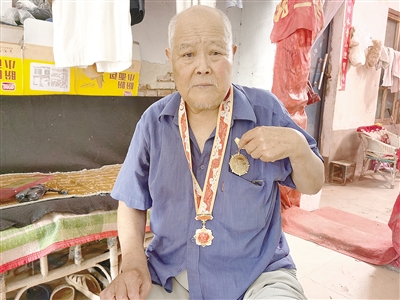 劉付強(qiáng)老人有一個珍藏的袋子,里面放著他的各種證件和國家為他發(fā)放的慶祝中華人民共和國成立70周年紀(jì)念章。