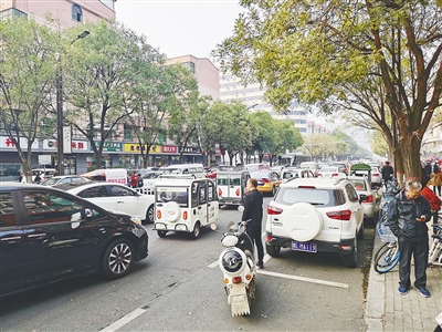 學(xué)校門前車輛亂停造成擁堵。