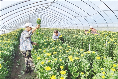 “干一天能掙60塊錢,比出門打工方便多了。旺季忙起來還有額外的加班費(fèi)!”幾名五六十歲的阿姨在大棚內(nèi)熟練地采摘著菊花。