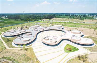 記者來(lái)到賈湖遺址博物館,映入眼簾的是古樸圓形建筑群。此建筑群整體外形像濺開(kāi)的水滴。陳列展區(qū)分為“禮樂(lè)之源”1個(gè)主題展廳和“賈湖探秘”“骨笛”“龜甲與符號(hào)”“墓葬與葬禮”4個(gè)專題展廳。每個(gè)展廳運(yùn)用人工智能、5G、MR、雷達(dá)投影互動(dòng)、3D動(dòng)畫(huà)等高新技術(shù),讓人們通過(guò)聲、光、電、影全方位感受賈湖文化的巨大魅力。