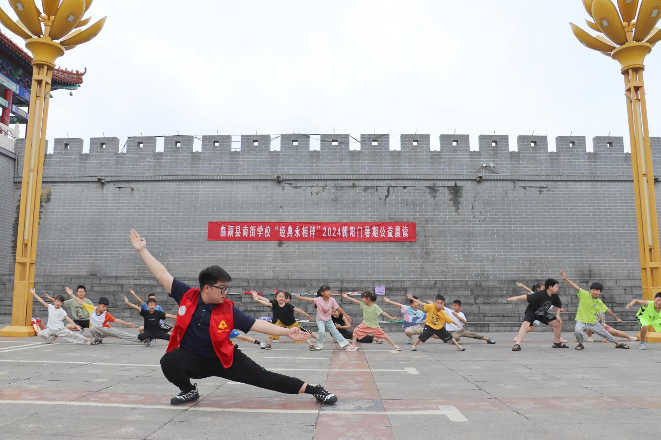 “沖拳!一,哈!二,哈!……”清晨,在漯河市臨潁縣南街村朝陽(yáng)門(mén)廣場(chǎng)激蕩著響亮的口號(hào)聲,這聲音整齊劃一、鏗鏘有力,伴隨著氣勢(shì)十足的聲音,只見(jiàn)孩子們做出馬步、穿掌、沖拳、踢腿等經(jīng)典的武術(shù)招式,動(dòng)作有力,虎虎生風(fēng)。