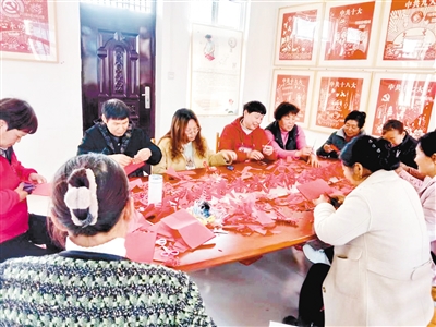村民一起學(xué)習(xí)剪紙技藝。